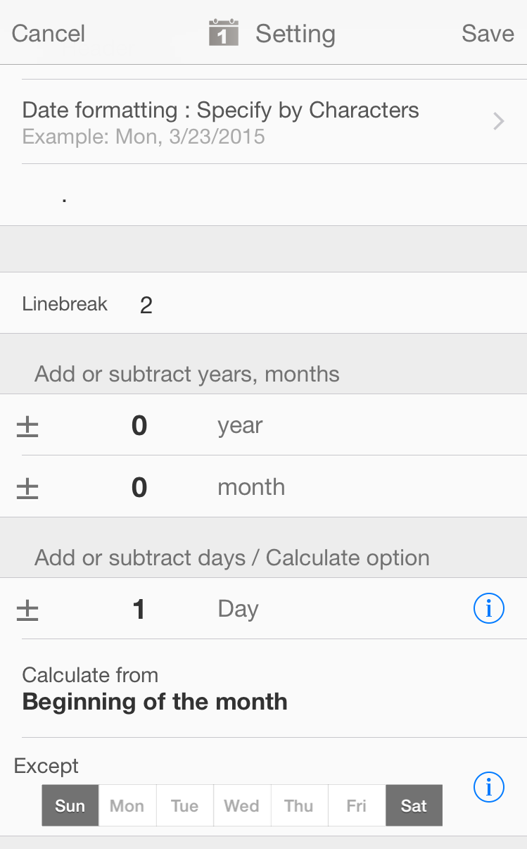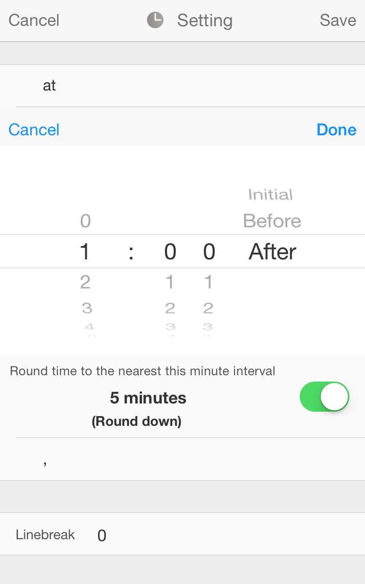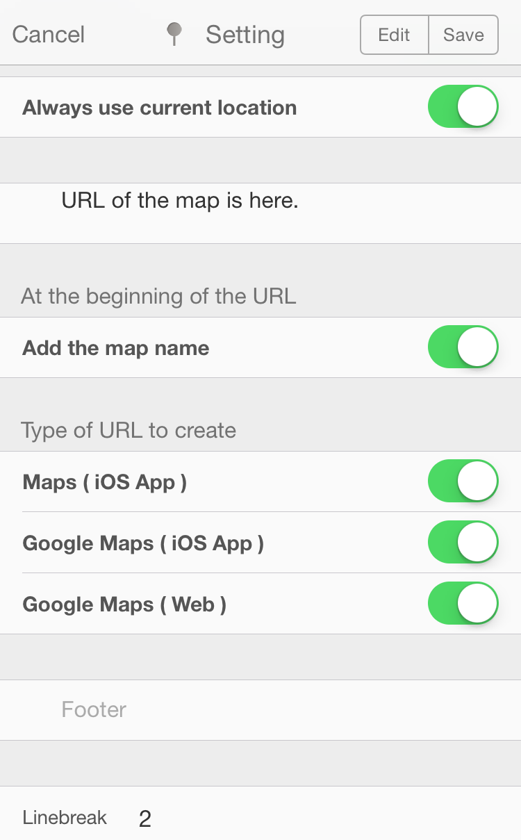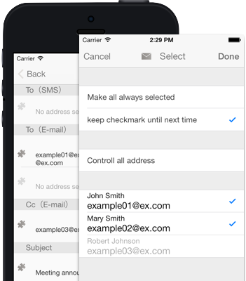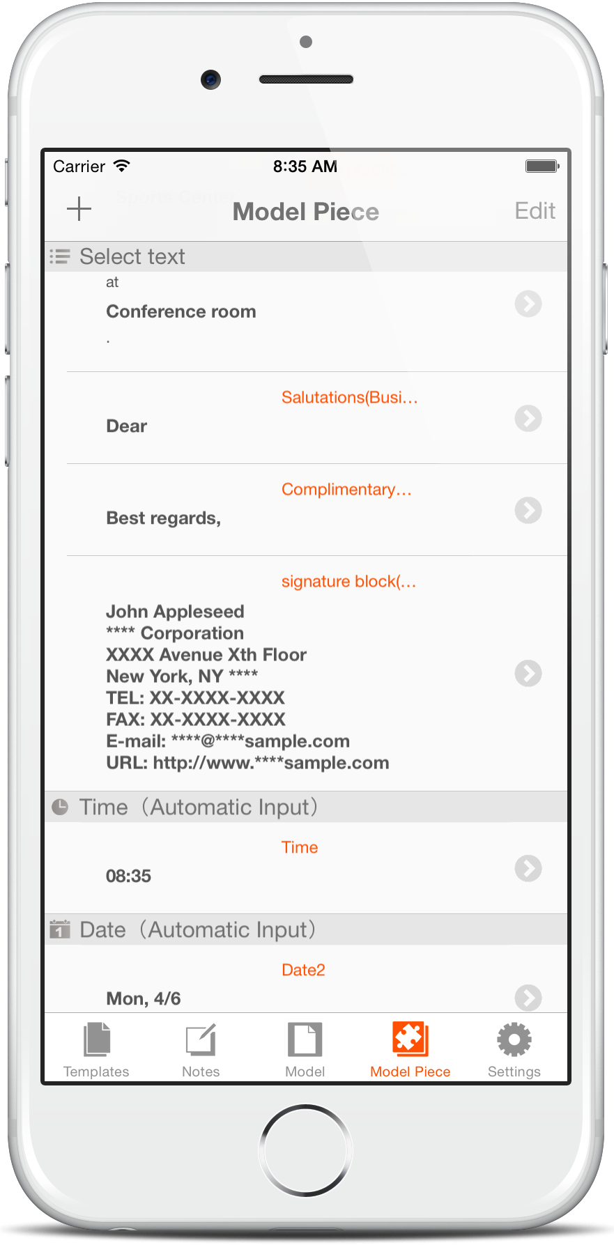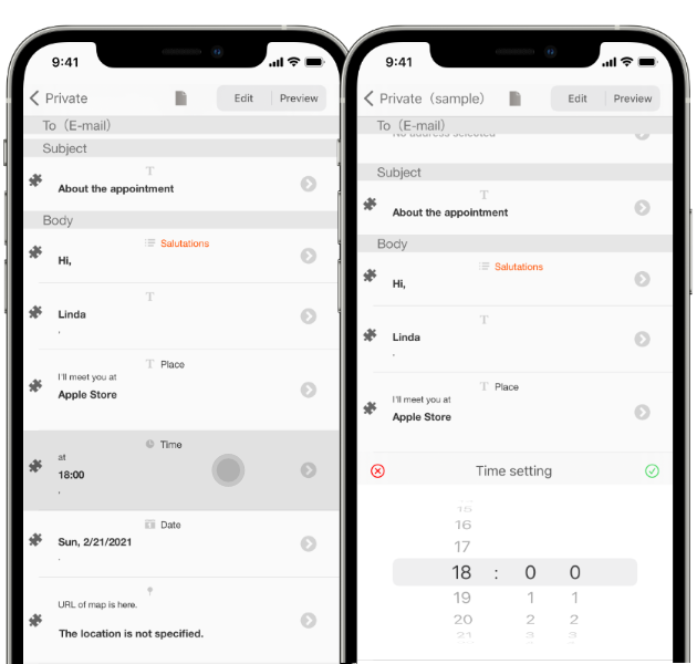 The way to input text is not only keyboard typing but also other ways, 'Select text', 'Input time automatically', 'Input date automatically' and 'Create URL to Maps'. And you can change by tapping whether text of pieces will be included in message. So you can keep the loss of time by typing text to a minimum. And you can make different messages from one template when you have to edit message in any situation.