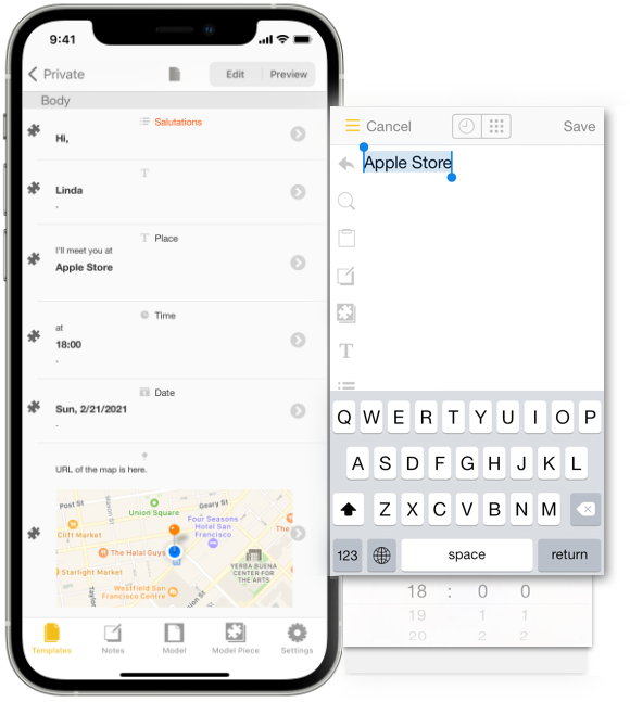 Drafts and informations you often use can be saved to Notes.